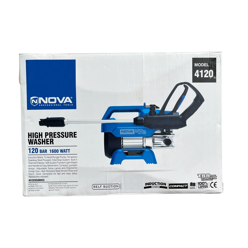 کارواش 120 بار دینامی نووا مدل 4120 یکی از مدلهای پرفروش برند نووا است که با موتور القایی (Induction) 1600 وات، قدرت و دوام بالایی را برای مصارف خانگی و نیمهسنگین فراهم میکند. این دستگاه برای شستشوی خودرو، حیاط، محوطه کارگاه، دیوار و سطوح مختلف طراحی شده و عملکردی سریع و مؤثر ارائه میدهد.